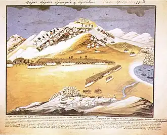 At first, Dramali turned against Nikitaras's corps at Agios Vasileios, which was more isolated and left a small force on the road to Agionori to occupy the Flessaians. Nikitara's men suffered losses and began to retreat towards Stefani, where they resisted effectively, assisted by Nikitas Flessas' corps. Finally, the Turks, caught between two fires, were defeated, losing at least 600 men (many historians put the losses at 1,000 men).[2] They would have suffered greater losses if the Greeks had continued to pursue them, but it seems that they were dazzled by the rich loot and stopped. Only Nikitaras with a few men continued the pursuit, helped by the women of Agionori who threw stones at the Turks from above. Thus, a large number of the defeated escaped, along with Dramali's himself, to Corinth where they were again blocked by the Greeks.[3]