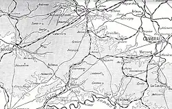 Orders came from Paris to abandon Lille, which was evacuated on 24 August and the 82nd Territorial Division formed a line from La Bassée to Corbehem, with the 81st Territorial Division forming a line from Aire to the sea. The Sixth Group of Reserve Divisions (also known as Groupe Ebener, with the 61st and 62nd Reserve divisions) were sent from Paris, increasing d'Amade's force to six divisions, to hold a 70 mi (110 km) line from Douai to Béthune and Aire, to the sea, with another 25,000 troops of the Lille garrison.[2] On 25 August, the German II Corps advanced westwards through Denain, to get behind the left flank of the BEF and after dark reached the vicinity of Cambrai, where rearguards of the 84th Territorial Division defended the Sensée Canal at Bouchain, against a German attempt to cross. During 26 August, the division slowly retreated west of Cambrai; Groupe Ebener arrived at Marquion and were then ordered by Joffre to Combles and Péronne, to become part of the Sixth Army. The divisions retreated westwards, covered by the 84th Territorial Division, in actions which diverted part of the German II Corps from the BEF during the Battle of Le Cateau (26 August).[3]