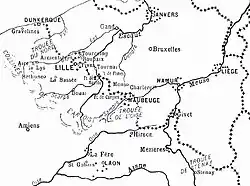 On 18 August, General Albert d'Amade formed a defence line from Maubeuge to Dunkirk, to prevent the disruption of railways by German cavalry raids. The Scarpe, Escaut and Rhonelle sluices were opened to extend the floods of the Scarpe and the old forts of de Maulde, Flines, Curgies, Condé and Le Quesnoy around Valenciennes were re-occupied. On 20 August, d'Amade formed a line of three territorial divisions de campagne, with the 84th Territorial Division from the Scarpe to the Sambre, the 82nd Territorial Division from the Sambre to the Lys and the 81st Territorial Division from the Lys to the sea. When the BEF advanced to the west of Maubeuge, the 84th Territorial Division advanced to Condé and formed a new defensive line along the Escaut, from Condé to Maulde. On 23 August, the 88th Territorial Division arrived near Lille from Paris, with orders to recapture Tournai. The division was bombarded by heavy artillery when close to Cysoing the next morning and slowly retired to Templeuve and Arras. After the Battle of Charleroi (21 August) and the Battle of Mons (23 August), Amiens became vulnerable to the advance of the 1st Army as it pursued the British Expeditionary Force (BEF) and the Fifth Army. At 2:00 a.m. on 24 August, the Siege of Maubeuge began and the 84th Territorial Division fell back towards Cambrai and Marquion. The rearguard was attacked near Fresnes, just south of Condé and next day, the division was engaged near Haspres and defeated.[1]