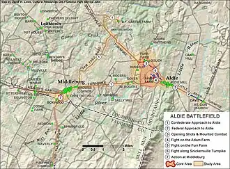 Early that very same morning, Colonel Munford led the 2nd and 3rd Virginia Cavalry eastward across the Loudoun Valley from Upperville through Middleburg to Aldie on the Bull Run Mountains on a reconnaissance and forage mission. He established a line of pickets in Aldie to watch for enemy activity and withdrew his two regiments northwest of town on the Snicker's Gap Turnpike to camp on the farm of Franklin Carter.