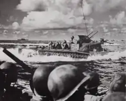 Bombardment of Angaur by the battleship Tennessee, four cruisers, and 40 Douglas SBD Dauntless dive bombers from the aircraft carrier Wasp began on 11 September 1944. Six days later on 17 September, the two RCTs landed on the northeast and southeast coasts. Not having enough troops to defend all the beaches, Goto selected the most attractive beach (code named Green Beach by the Americans) for an amphibious landing to build his beach defenses. His defenses consisted of a formidable array of pillboxes, blockhouses, trenches and antitank ditches. Seeing the buildup around Green Beach, Mueller decided to land his troops at the more constricted but less defended beaches of Red and Blue Beach. The 322nd RCT received sporadic mortar and machine gun fire, but they landed fairly unopposed and with light casualties. The 321st landing at Blue Beach faced heavier machine gun and mortar fire, but it too was able to get ashore with minimal casualties.[5]