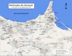 Melilla was only some 40 kilometres (25 mi) away, but the garrison there was in no position to help since the city was almost defenceless and lacked properly-trained troops. The exhausted and demoralised survivors of Annual who reached Melilla were in no condition to reinforce the existing garrison effectively. However, the Rifian forces had largely dispersed following the capture of Monte Arruit, leaving el-Krim with insufficient men to lay siege to Melilla. In addition, citizens of other European nations lived in Melilla, and he did not wish to risk international intervention.[23] El-Krim later stated that to have been his greatest mistake.[24]