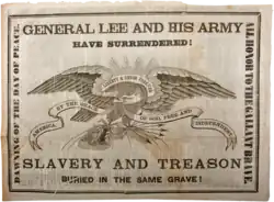 ![]() A print depicting Ulysses S. Grant, Commanding General of the Union Army, accepting Confederate General in Chief Robert E. Lee's surrender on April 9, 1865 | |||||||