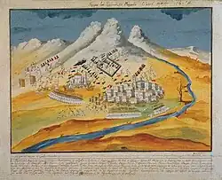 Mustafa Bey, who had emerged from his tent to encourage his troops, was mortally wounded in the forehead. On the following day the kehaya assumed command, as a snowstorm swept through the area. Once Mustafa Bey's condition became known to his officers, the Albanian officers threatened to lay down arms unless the terms of the Greeks were satisfied.[15] On the midday of 24 November, 700 Ottomans charged at a small picket guarding the road towards the Agia Ierousalim monastery. At the same time, Abdullah Aga ordered the retreat of his forces. Although the initial breakout was successful, the Greeks regrouped, splitting the Turks in half. The 500 Turks who still held the camp were surrounded and slain, as were most of those who broke out. The soldiers who encountered the kehaya ignored his pleas for mercy as they did not speak Turkish, killing him.[16]