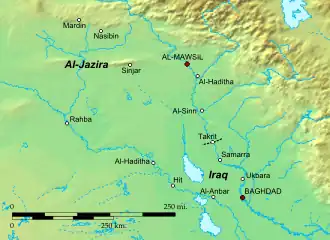 Baghdad became a Buyid possession when Ahmad ibn Buya advanced from Ahvaz with his army and entered the city in December 945. Upon his arrival he met with the Abbasid caliph al-Mustakfi, who agreed to give him control of the affairs of the state and conferred on him the honorific of "Mu'izz al-Dawla."[2] News of this event was received negatively by the Hamdanid amir Nasir al-Dawla, who ruled over Mosul and the districts of the eastern Jazira. Nasir al-Dawla had previously controlled Baghdad in 942 and he still entertained hopes of regaining the city;[3] Mu'izz al-Dawla's takeover of the capital was therefore an unwelcome development for him.
