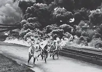 ![]() Japanese troops of the Sakaguchi Detachment advancing through Balikpapan's burning oilfields. | |||||||