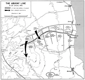 Battles were fought at Longoskawayan Point from 22 January to 1 February, at Quinauan Point from January 22 to February 8, and at the Silalim-Anyasan from 27 January to 13 February, which were collectively termed the "Battle of the Points". The final result was the complete destruction of the Japanese 1st and 2nd Battalions, 20th Infantry.[6]: 249–323