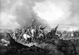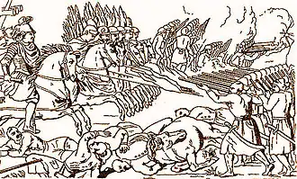 The "king insisted, at a night council, on engaging the enemy in a decisive battle the next day, Friday, 30 June".[18] The Crown Army appeared out of the "morning mist in full strength" but only the Tatars engaged in skirmishes which was met by the Polish artillery.[18] The Cossack defences consisted of two fortified camps, a larger for the registered Cossacks and a smaller for the peasant militia, both protected by 10 lines of chained wagons.[19] At 3 p.m. Duke Jeremi Wiśniowiecki led a successful charge of 18 cavalry companies against the right wing of the Cossack-Tatar armies and "the zealous cavalry attack was a success: it broke up the rows of Cossack infantry and the wagons moving in corral formation".[20] However the Cossacks regrouped, pushed the Polish cavalry out of the camp and advanced further with the help of the Tatars. The left flank of the Polish army started to retreat when the King reinforced it with all German mercenaries under command of Colonel Houwaldt who repulsed the attack and "drove the Tatars from the field".[20][21] During the fighting, a Polish nobleman called Otwinowski noticed the Tatar Khan's standard, and Polish artillery was directed to fire at it. The Khan's brother Amurat was wounded mortally. With the battle already turning against them, the Tatar forces panicked, "abandoning the Khan's camp as it stood", and fled the battlefield leaving most of their belongings behind. Khmelnytsky and Vyhovsky with a few Cossacks chased Khan attempting to bring him with his force back, but were taken hostage to be released when the battle was over.[22] A heavy rain started which complicated cavalry operations. With the Tatar cavalry gone, the Cossacks moved their wagons in the night to a better defensive position closer to the river, dug trenches and constructed walls to Polish surprise in the morning.