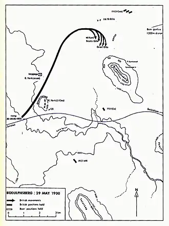 The Battle of Biddulphsberg was an engagement of the Second Boer War on May 29, 1900, and was part of the Advance on Pretoria. Troops of the 8th Division were stationed in the Southern regions of the Orange Free State in order to cover Lord Roberts' advance on Transvaal, and to prevent the Orange Free State from falling back under Boer control. The British attempted to storm Biddulphsberg-kopje, which was defended by Boers of the Senekal Commando, however were unable to due to a fire that spread in the grass, forcing a retreat. [1][2]