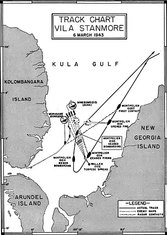 On the night of 5 March 1943, the Japanese destroyers Murasame and Minegumo took supplies to the Japanese base at Vila.[4] Together, these ships formed part of the 2nd Fleet's Destroyer Squadron 4, which was under the command of Captain Masao Tachibana.[5] Their passage to Vila was undertaken through the Vella Gulf and Blackett Strait, while they decided to return to the Shortland Islands via the shorter route through the Kula Gulf.[6]