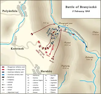 Jäger officer Rezső Tirts describes their flank attack against the final Austrian position on the plateau as follows: But now all at once there was a loud crack of rifles from the Devil's Hole. It was the flank attack of the Újházy jägers, to which six hussar trumpeters blew the jäger march. One after another, their well-aimed shots dropped the artillerymen on the hill. At this moment the Piller Brigade also arrived with swift steps on the battlefield from Szepesváralja and rushed up the hill to the sound of all the drums. All this had an inspiring effect on the Honvéds, and a crushing effect on the Austrians, whose ranks began to waver. Then the Honvéds rushed out of the woods with their bayonets [pointed at the enemy], crying 'Forward! Forward!' from a thousand and a thousand throats, so that it could be heard all the way to Korotnok. The Austrians were in a panic, their ranks broke up, cannons, horses, men, all the Austrian troops went on a wild and disorderly run down the other slope, and at 4 o'clock in the afternoon, on the top of the Branyiszkó Pass, on the little hill near the Chvala Bohu [Praise God in Slovakian] tavern, the Hungarian flag, raised by the Újházy jägers, proclaimed one of the most beautiful Hungarian victories.[11] Several Austrian chevau-légers trapped in the tavern were taken prisoner by a hussar with the nickname Csősz Bácsi (Uncle Field-guard), after he went in and asked the tavern keeper for a drink.[12] Another factor in the Austrian rout was that Major General Deym did not want to press the pass's defense any further,[14] because his troops were flanked by the encircling Hungarian units.[15]