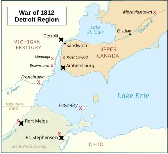 On August 5, 1812, Major Thomas Van Horne and the 200 U.S. soldiers were en route south to the River Raisin, where they were to pick up cattle and other needed supplies and escort them back to Fort Detroit for the use of Brigadier General William Hull. Hull was, at the time, in the Canadian village of Sandwich, now known as Windsor, Ontario, although he would abandon his position there and return to Detroit on August 8.[1]