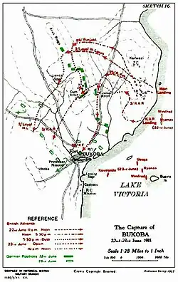 The Battle of Bukoba was the first victory for Entente forces in German East Africa, coming after the disastrous battles of Tanga and Jassin. The British objective was the destruction of the Bukoba wireless station. Due to Bukoba's location on the shore of Lake Victoria, it was decided that the raid should take the form of an amphibious assault.[1]