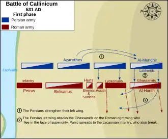 The two armies met outside Callinicum on 19 April 531. Belisarius anchored his left flank on the Euphrates, composed of the Byzantine heavy infantry under the command of the emperor Justinian's bodyguard Petrus. The Byzantine cavalry was stationed in the center, many of which were cataphracts under the command of Ascan. Next were the Lycaonian and/or Isaurian infantry under Stephanacius and Longinus, positioned such that their right was anchored on a rising slope occupied by the army's right wing, which consisted of the 5,000 allied Ghassanid cavalry. Belisarius himself took up a position in the center of his army.[7] Unlike his deployment at Dara, he concentrated his best cavalry in the center and the infantry and allied cavalry on the wings, possibly because he anticipated the infantry and Ghassanid cavalry could flee.[8]