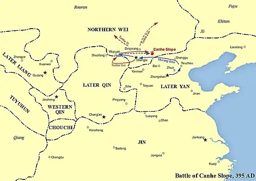 The Battle of Canhe Slope, alternatively the Battle of Canhebei (Chinese: 參合陂之戰), was a battle in the history of China in 395 where the Xianbei-led Later Yan dynasty, then ruling over northern and central China, had launched a punitive campaign against its former vassal, the Northern Wei dynasty, also of Xianbei extraction.