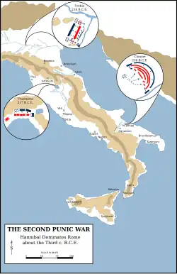 Shortly after the start of the Second Punic War, Hannibal crossed into Italy by traversing the Pyrenees and the Alps during the summer and early autumn of 218 BC.[6] He quickly won major victories over the Romans at Trebia and at Lake Trasimene.[7][8] After these losses, the Romans appointed Quintus Fabius Maximus Verrucosus as dictator to deal with the threat.[9][10]