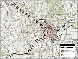 Carter had been instructed not to pursue McNeil if he fled in any direction other than the road to Fredericktown and Pilot Knob.[10] However, Carter also disobeyed orders and indeed pursued McNeil to within four miles of Cape Girardeau, arriving mid-day on April 25.[11] Carter then sent a letter to McNeil demanding the garrison's surrender and a reply within 30 minutes. The letter was signed by Confederate Major General Sterling Price with the hope that his name would instill fear in McNeil that General Price was nearby.[12] However, McNeil was confident in the strength of his defense and refused to surrender.[13] Fearing an attack, Carter sent word of the situation to General Marmaduke, who then proceeded with Colonel Shelby's column to reinforce Carter's troops in any possible actions at Cape Girardeau.[14]