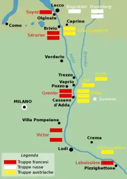 Schérer deployed the divisions of MGs Paul Grenier, Claude Victor, Jean Sérurier (each of the three divisions had around 8,000 men[13]), and Pierre de Laboissière (4,000 men;[13] from Villa Pompeiana to the Po River[15]) to defend the line of the Adda River. Victor's and Grenier's divisions included the Polish and Helvetic legions.[46]