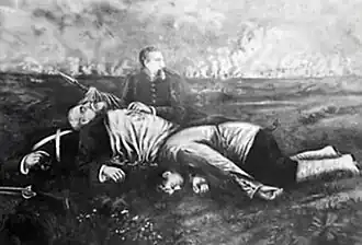 At 6am local time, Camilo Álvarez moved to capture the road connecting Chalchuapa to Santa Ana and Luis Molina covered Álvarez's flanks.[1] The town was surrounded by 9am. Barrios himself took charge of a division and attacked the entrenched Salvadoran positions.[1][3] Barrios was killed in action by Salvadoran soldiers when he was shot in the heart and fell off his horse.[1][5] Other reports claim that he was shot by a Guatemalan soldier who shot Barrios by accident.[9]