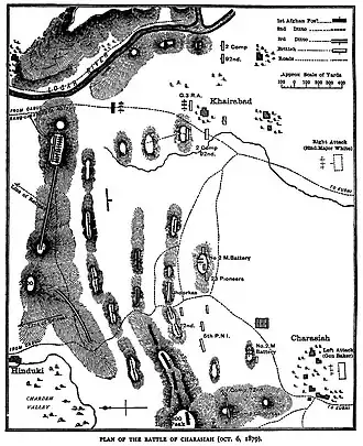 The spelling of the battle varied. The formal dispatch published in The London Gazette stated 'Charasiab',[3] the regiments present received the battle honour 'Charasiah',[4] while General Roberts' memoirs[5] and the clasp authorised for the Afghanistan Medal referred to 'Charasia'.[6]