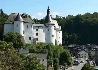 The Battle of Clervaux or the Battle for Clervaux[5] (in English sources, Clervaux is occasionally called by the German name Clerf)[6] was an opening engagement of the Battle of the Bulge that took place in the town of Clervaux in northern Luxembourg.[7] It lasted from December 16 to 18, 1944.[7] German forces encircled numerically inferior American forces, primarily from the 28th Infantry Division's 110th Infantry Regiment and the 109th Field Artillery Battalion, and quickly forced them to surrender. The battle has been referred to as the Luxembourg "Alamo".[8][9][10]