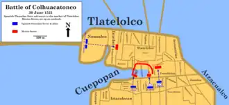 Cortés divided his troops into three groups to attack through the three main roads that lead to the market within the campan of Cuepopan, in what is now Cuauhtémoc borough: one controlled by Alderete, with 70 Spaniards, 7 or 8 horses at the rear and between 15,000 and 20,000 natives; another controlled by Andrés de Tapia and Pedro de Alvarado's brother Jorge, with 80 Spaniards, 10,000 natives and 8 horses, aside from 10 artillery pieces which would remain at their road's entrance;[58] and the third and largest one commanded by Cortés himself, his group possessing 100 Spanish infantry, 25 crossbowmen and arquebusiers, 8 horses and an "infinite number" of indigenous warriors from his allies.[59][2] Alderete would attack through the main road that lead to the market, in what is now República de Brasil street at the east; Tapia and Jorge de Alvarado would attack through a more narrow road, probably in modern-day Eje Central avenue in western Tezcatzonco calpolli at the west, and Cortés between them through the narrowest, in modern-day República de Chile street in eastern Colhuacatonco calpolli.[59][60][61]