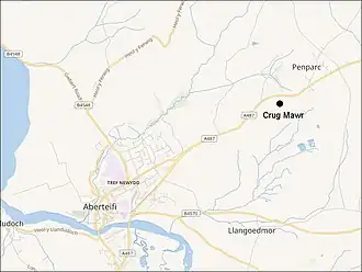 The exact location of the battlefield is not known. The Royal Commission on the Ancient and Historical Monuments of Wales puts the site of the battle on the southeast slopes of Banc y Warren (or Banc-y-Warren), a prominent conical hill near Penparc, 2 miles (3.2 km) northeast of Cardigan. There is a farm on the southeast slope named Crugmore.[3] A geophysical survey and archaeological appraisal were carried out at Crugmore Farm in 2014 in support of planning applications. No evidence indicative of a battle was found in the areas covered by the surveys. Some accounts place the site on the northeast of the hill, which may be more likely because the road from Cardigan bends round the northeast side of the hill before turning more northerly again. The southeast side of the hill does not coincide with a road.[4][5][6] The hill was known as Crug Mawr at least as early as the 9th century.[7]