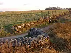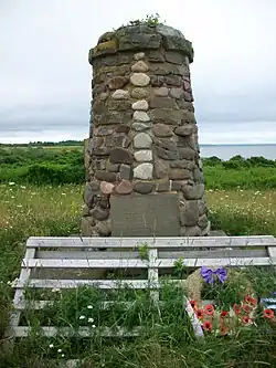It was the last pitched battle fought on British soil.[62] Today, a visitor centre is located near the site of the battle. It was first opened in December 2007, with the intention of preserving the battlefield in a condition similar to how it was on 16 April 1746.[63] One difference is that it currently is covered in shrubs and heather. During the 18th century, however, the area was used as common grazing ground, mainly for tenants of the Culloden estate.[64] Those visiting can walk the site by way of footpaths on the ground and can also enjoy a view from above on a raised platform.[65] Possibly the most recognisable feature of the battlefield today is the 20-foot (6 m)-tall memorial cairn, erected by Duncan Forbes in 1881.[61] In the same year, Forbes also erected headstones to mark the mass graves of the clans.[66] The thatched roofed farmhouse of Leanach that stands today dates from about 1760; however, it stands on the same location as the turf-walled cottage that probably served as a field hospital for government troops following the battle.[64] A stone, known as "The English Stone", is situated west of the Old Leanach cottage and is said to mark the burial place of the government dead.[67] West of this site lies another stone, erected by Forbes to mark the place that the body of Alexander McGillivray of Dunmaglass was found after the battle.[68][69] A stone lies on the eastern side of the battlefield and is supposed to mark the spot from which Cumberland directed the battle.[70] The battlefield has been inventoried and protected by Historic Scotland under the Historic Environment (Amendment) Act 2011.[71]