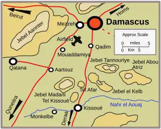 The plan called for the troops of 5th Indian Brigade to advance northwards from their positions at Artouz on the Quneitra–Damascus road across country west of the road towards Mezzeh. Mezzeh was a large village on a junction with the Beirut to Damascus road, some three miles west of Damascus itself. The brigade's supplies, ammunition and the anti-tank element would follow closely behind on the road proper. Meanwhile, the Free French forces would advance along the Kissoué – Damascus road to capture Qadim as a preliminary to entering the Syrian capital, some four miles further north.[2]
