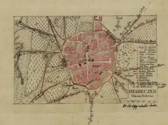 The historian Róbert Hermann and Attila Horváth point out that Nagysándor deployed his troops, not in a very lucky fashion. If Nagysándor wanted to retreat safely towards Derecske, after forcing the Russians, with the shootings of his artillery, to deploy their troops for battle and, in this way delay their pursuit, he would have deployed his corps on the southwestern part of the city.[20] Instead of this Nagysándor deployed his troops in a line in front of the city. He deployed on the left flank the infantry division of 4,500 soldiers led by Colonel János Máriássy and 16 cannons.[6][21] Máriássy managed to hide his division behind the hills and mounds which lay in front of them.[21] The center stretching from the Köntös dam to Kokasló was occupied by the 1,500-strong infantry division and 6 cannons of Lieutenant colonel János Bobich. The brick pits from Kokasló were defended by the 6. Honvéd battalion and the Defense Battalion of Hont County with 3 cannons, while the Köntös garden was held by 3 battalions and 3 cannons.[21] On the right flank the Korponay division was placed from Kokasló to the Nyulas taproom with around 2,500 weak infantry, which partially lacked firearms, supported by the newly formed 96. Honvéd battalion, 12 cannons and 1 ½ hussar company.[21] In the large forested area from the north of the town, called Nagyerdő (Great Forest) was sent only 2 companies of the 89. Honvéd battalion and a platoon of the 14. Lehel hussar regiment ordered to make big noise, in order to "confuse the enemy".[21] The vanguard was made by 4 companies of the 1. Imperial hussar regiment.[21] Nagysándor placed 4 companies of the 8. Hussar Regiment, on the left, another four on the right wing, while the remaining 4 companies he kept as reserve, together with a battalion of militia armed with lances, probably from the Korponay division.[11][21] In front of his lines the cornfield blocked his view, while on the right flank he left the Debrecen woods (called Nagyerdő) almost completely unoccupied, which enabled the Russians to deploy their troops and encircle the right wing undetected.[6]