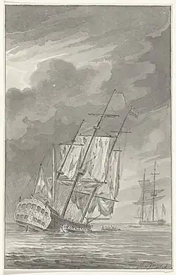 The Dutch were politically in turmoil, and were consequently unable to mount any sort of effective actions against the British.[5] The result of this inaction was the collapse of their economically important trade.[6] It was finally decided that a merchant fleet had to be launched. On 1 August 1781, Admiral Johan Zoutman led a fleet of some 70 merchantmen from the Texel, protected by seven ships of the line as well as a number of frigates and smaller armed vessels. Admiral Sir Hyde Parker was accompanying a convoy of ships from the Baltic when he spotted the sails of the Dutch fleet at 04:00 on the morning of 5 August. He immediately despatched his convoy toward the English coast, and ordered his line to give chase rather than prepare for battle.[7]: 48 Zoutman, whose ships had been interspersed with the merchantmen, signalled his line to form in between Parker and the convoy. The ships of Parker's fleet were not in the best of condition, since great demands were placed on the Royal Navy by the war, and all manner of ships were pressed into service, or did not receive necessary maintenance. Some ships were in such poor condition that the number of guns available to fire was reduced from its normal complement. The ships had had no time to practise the normal fleet manoeuvres.[7]: 46 In spite of this, Berwick and Parker's flagship Fortitude, both 74 guns, were both relatively new and in good shape. The Dutch crews were inexperienced as they had not seen any significant action due to the British blockade.