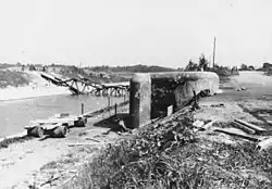 The Belgian 7th Infantry Division was assigned to guard the three bridges over the canal, supplementing the troops who garrisoned Fort Ében-Émael at the time of the battle.[Notes 2] The defences for each bridge consisted of four large concrete pillboxes on the western side of the canal, three equipped with machine-guns and a fourth with an anti-tank gun; the bunker containing the anti-tank gun was positioned close to the road leading from the bridge, with one machinegun-equipped bunker immediately behind the bridge and two others flanking the bridge a short distance either side.[7] A company position existed on the western bank of the canal by each of the bridges, with a small observation post on the eastern side, which could be quickly recalled, and all three bridges could be destroyed with demolition charges set into their structures, triggered by a firing mechanism situated in the anti-tank bunkers.[7]