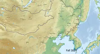 The Battle of Fort Zhenjiang (Chinese: 鎮江之戰) was a military conflict between the Later Jin and the Ming dynasty. In the fall of 1621 Ming general Mao Wenlong captured Fort Zhenjiang on the border of the Jin-Joseon border and held it against multiple Jin assaults before retreating. Nurhaci burnt down the fort afterwards rather than risk having it captured again.