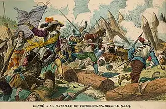 Despite the difficult ground over which he had to manoeuvre, Turenne began his attack as planned. However, he was driven back by Mercy's reserves of infantry and supporting cuirassiers, and unable to make progress against determined resistance.[18] Meanwhile, ignoring the protests of his subordinates, Condé personally led the assault on the Schönberg. His men took the positions after several hours of fighting, but suffered heavy casualties doing so, while it was now too dark to follow up their success. Although Turenne had finally resumed his advance, many of his men were still coming up, slowed by heavy rain, and at midnight the two commanders agreed to halt operations.[19]