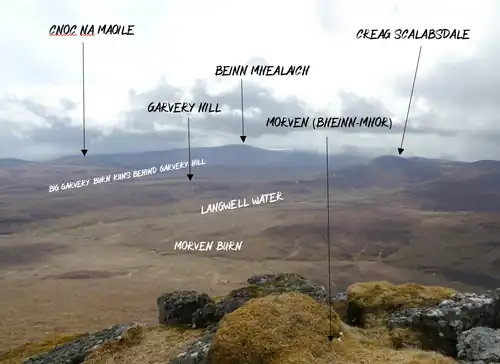 ![]() Approximate location of the battle, looking south, taken from the peak of Morven (Anglicised from 'A' Mhòr Bheinn', also referred to as ''Bheinn Mòr" by Robert Gordon. It essentially just means 'The Big Hill'). 'Garvery' is an Anglicisation of 'Garbharry', the name of the hill and burn(s) just to the south of Morven. | |||||||
