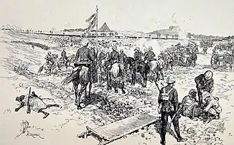As the Second Brigade fought through the palm groves near Ginnis, Mahdist riflemen fired several volleys at the First Brigade. Although the firing was inaccurate, the smoke that it created allowed spearmen to surprise the Camel Corps.[2] In the ensuing skirmish, that detachment was forced to withdraw, but the Durham Light Infantry moved forward and repulsed the Mahdist attack.