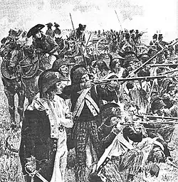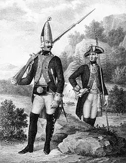 The smooth-bore, flintlock muzzle-loading rifles fired cartridges that contained the gunpowder and the bullet in a paper case. The French Musket Model 1777 (caliber 18 mm) was more precise than the Russian one.[100] According to Meyer, there were accidents with the Russians because they loaded extremely quickly, too Their powder was "of extremely poor quality". They had bayonets almost twice as long as the French. In addition, their officers also wore the halberd-like spontoon, which had long since been abolished in France,[101] their NCOs that "Short rifle" similar to the spontoon. The Cossacks sometimes stabbed the wounded to death with their lances, "but they were not heroes in front of the enemy."[102]