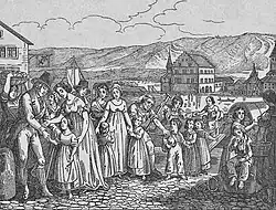 The Helvetic Revolution of 1798[19] led to a radical change in the Swiss constitution and to the military occupation of the country by France. According to Glarus pastor Markus Freuler, this was because the old constitution "was no longer arbitrary to a large part of Switzerland and was no longer appropriate to the spirit of the people," and because only an external power was able to "carry out this important work."[20] At that time, the state of Glarus, where Anna Göldi was executed as a witch in 1782, renounced its rights to rule in numerous bailiwicks, but stuck to its old constitution. When its Militia troops were defeated at Wollerau, it only escaped military occupation by accepting the new constitution. The Flecken Glarus became the capital of the Greater Canton of Linth,[21] loudly Freuler under the "wise direction" of Government Governor Joachim Heer.[22] But despite the promises made, after the Austrians' advance, Graubünden for the quartering of French troops. In April 1799, the confiscation of Glarus artillery led to an uprising. When the Austrians replaced the French as occupying power in May, the state of Glarus returned to the Ancien Régime for a short time, with even the instigator of the judicial murder of Anna Göldi receiving government honors.[23] In August the French then invaded again.[24]