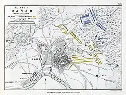 Wrede, following successful skirmishing against the French, began to deploy his forces to face the main French force of 20,000. On 30 October Wrede placed his centre with the River Kinzig behind it, and his right wing to its south in an isolated position with only a single bridge linking it with the main force. Napoleon had only 17,000 troops[11] including Marshal MacDonald’s infantry and General Sébastiani’s cavalry to face the enemy forces blocking them. Due to dense forests on the east of Wrede’s positions the French were able to advance and make close contact with the allies almost unseen.[11] Napoleon decided to attack the allies' left with all available troops. By midday Marshal Victor and MacDonald had cleared the forest in front of the allies' centre. Soon after, General Drouot found a track in the forest towards Wrede’s left on which cannon could be moved. Three hours later Grenadiers of the Old Guard had cleared the area of allied troops and Drouot began to deploy 50 cannons supported by cavalry of the Guard and Sébastiani.[11] A brief artillery bombardment from Drouot’s cannons silenced Wrede’s 28 cannons. French cavalry then attacked and pushed back Wrede’s cavalry on his left flank, then attacked the flank of Wrede’s centre. Wrede’s centre started to fall back, skirting the banks of the Kinzig River and suffering heavy casualties. On the right wing, Wrede’s forces tried to cross the single bridge over the Kinzig River to reinforce the centre, but many drowned in the attempt.[11] Wrede was successful in rallying his troops to form a defensive line running from Lamboy Bridge to the town of Hanau. During the night the allies abandoned Hanau. The French occupied Hanau on 31 October with little resistance. Napoleon made no effort to pursue Wrede, the main road to Frankfurt was now reopened, the French retreat continued.