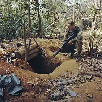 ![]() An Australian soldier from 9 RAR looking into a Viet Cong bunker during Operation Goodwood, January 1969. | |||||||