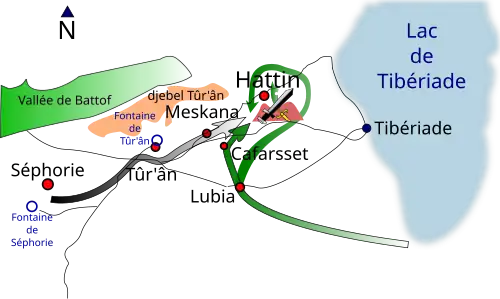 In late May, Saladin assembled the largest army he had ever commanded on the Golan Heights, around 40,000 men, including about 12,000 regular cavalry.[11][24][12] He inspected his forces at Tell-Ashtara before crossing the River Jordan on 30 June.[11] Saladin had unexpectedly gained the alliance of the Druze community based in Sarahmul led by Jamal ad-Din Hajji, whose father, Karama, was a longtime ally of Nur ad-Din Zangi.[25] The city of Sarahmul had been sacked by the Crusaders on various occasions and according to Jamal ad-Din Hajji the Crusaders had even manipulated the Assassins into killing his three elder brothers. Saladin's army was organised as a centre and two wings: Gökböri commanded the left of the army, Saladin himself commanded the centre and his nephew, Al-Muzaffar Umar (Taki ad-Din), the right.[26][27]