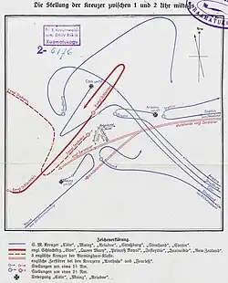 Attempts to rescue the crew were interrupted by the arrival of a submarine; one survivor was rescued by a German ship two days later, out of some 250 men who had survived the sinking. Rear Admiral Maass perished with his ship.[18] Four German cruisers survived the engagement, saved by the mist. Strassburg nearly approached the battlecruisers but saw them in time and turned away. She had four funnels, like the British Town-class cruisers, which caused sufficient confusion to allow her time to disappear into the mist. The German battlecruisers Moltke and Von der Tann left the Jade at 14:10 and began a cautious search for other ships. Rear Admiral Hipper arrived in Seydlitz at 15:10 but by then the battle was over.[19]