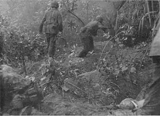 Company I was sent up, and its commander, misreading the situation and thinking that the Japanese held the crest of the ridge rather than the foot of its reverse slope, ordered a three-pronged "double envelopment" maneuver,[15] utilizing two elements of his force to flank while the third attacked frontally. With almost no appreciation of the situation or the terrain, the maneuvering elements turned-in to affect the envelopment too soon and consequently moved into the flanks of the platoon that was in contact, rather than the Japanese emplacements. Consequently, they too began to take heavy fire, and as a result Company I commander gave the order to withdraw so that an artillery strike could be called down on the Japanese. This too proved to be unsuccessful in forcing the Japanese from the hill, and Company I returned to the main defensive position before sunset.[16]