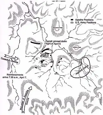 Carroll spent an uncomfortable, waterless night and the next morning, April 7, the Apache began to close in on him. He was saved from further casualties by the arrival of additional army soldiers and Indian scouts. The two companies of his command several miles in his rear had been unaware of his plight and spent the night outside the basin, but they advanced into the basin that morning. Also, arriving at the basin that morning was Capt. McClellan with his 85 American soldiers, including a company of Buffalo soldiers, 40 Indian scouts, and 100 White Mountain Apache, enemies of the Chiricuahua. The soldiers advanced on the Apache positions while Lt. Gatewood led the Apache scouts in a flank attack on the Apache encampment, populated with women and children. Now faced with a force of nearly 400 soldiers and Indian scouts, Victorio began a withdrawal. He removed his warriors encircling Carroll to a high ridge south of the battlefield and held the army forces at bay for a few hours while the Apache women and children fled the area. Victorio then withdrew his men in stages, with a rear guard remaining vigilant until the next morning, April 8, when it retreated after a brief skirmish.[11]