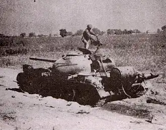 ![]() Pakistani soldier standing on a knocked out Indian T-54 tank during the Battle of Hussainiwala in the Sulemanki sector. | |||||||||