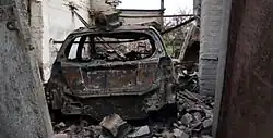 According to the DPR, a large number of Ukrainian soldiers and paramilitaries were trapped in the town.[57] During the fighting, the Ukrainian commander of the Dnipro Battalion suffered a concussion, while the commander of the Kherson Battalion was killed.[12] In response to commander Semenchenko's pleas, many Euromaidan activists in the Ukrainian capital Kyiv protested what they saw as the government's "abandonment" of the volunteers fighting against the insurgents.[58] Repeated artillery barrages launched by insurgent forces from nearby villages caused heavy casualties amongst the trapped Ukrainian forces.[11]