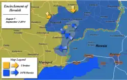 - ^ In addition, in Russian and Ukrainian, the battle is referred to as the "Ilovaisk Kettle" (Russian: Иловайский котёл, romanized: Ilovayskiy kotyol; Ukrainian: Іловайський котел, romanized: Ilovaiskyi kotel). The word "kettle" refers to encirclement by enemy forces, which is termed "falling into the kettle". The word is also used to refer to battles during the Second World War, such as the "Kiev Kettle". It is also applied to the early 2015 Battle of Debaltseve, which has been described as a "Second Ilovaisk".