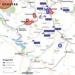 Soon after securing the area around the Savur-Mohyla hill (Amvrosiivka Raion and Shakhtarsk Raion), on 31 July 2014, a battalion of the 25th Airborne Brigade was sent to assault Shakhtarsk.[41] During the attack, the battalion lost 26 soldiers and passed the city from East traveling North conducting a raid towards villages of Petropavlivka and Orlovo-Ivanivka.[41] Two other battalions traveling past Torez and Snizhne were supposed to reach Miusynsk.[41] Along the line, those two battalions, from the 30th and 95th brigades, lost communication with each other, but later the battalion from the 95th Brigade met up with the battalion of the 25th Brigade near Orlovo-Ivanivka and exited towards Ukrainian forces at Debaltseve.[41]