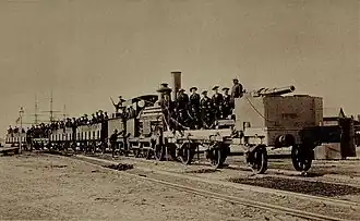 The British force was split into two wings: The left wing would follow the canal. It comprised four companies each of the South Staffordshire and Duke of Cornwall's regiments (800 men in all), accompanied by a naval 9-pounder gun and 80 mounted infantry who would operate on the East bank. On the West bank were six companies of Rifles (500 men) and another 9-pounder. The right wing would follow the railway line and was made up of 1,000 marines. It was supported by an armoured train, the brainchild of Captain Jacky Fisher, which sported a 40-pounder gun, a Nordenfelt, two Gatlings and two more nine-pounders.[4] The whole force, including 200 sailors manning the train and the 9-pounders, numbered around 2,600 men.[3]: 94