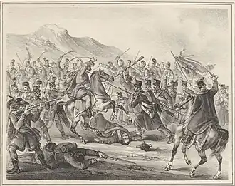 But then a handful of the infantry uhlans of the Polish Legion and the 20th Honvéd Battalion took a stance in their way at the tavern from Bárca. Major Wladyslaw Tchorznicki, the leader of the group, was a true veteran, having fought in the Polish uprising of 1830-31.[6] He took up a position behind the stone wall of the tavern with his soldiers, let the Imperial Cavalry close in, and then poured such a volley of fire on them that Major Concorreggio and several of the officers were killed, Scudier was wounded and taken prisoner, and the others fled struck by panic.[6] Thanks to them the rest of the Hungarian army could retreat to Miskolc unharmed.[6]